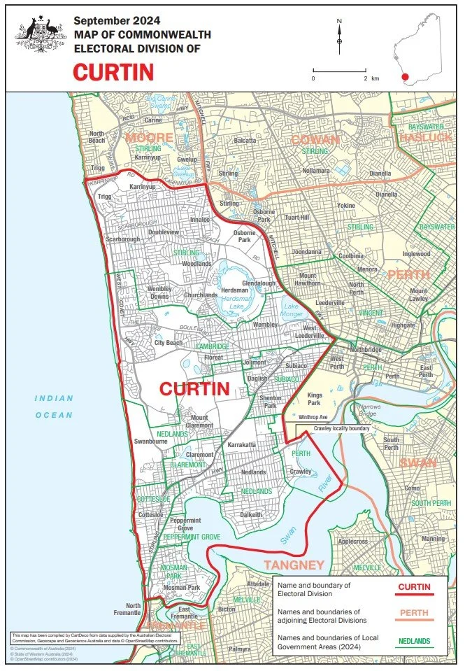 The Curtin electorate stretches over 96 square kilometers in Perth's western suburbs and coastal areas (see map below). The electorate is defined by its stunning beaches, parks, and diverse landscapes.